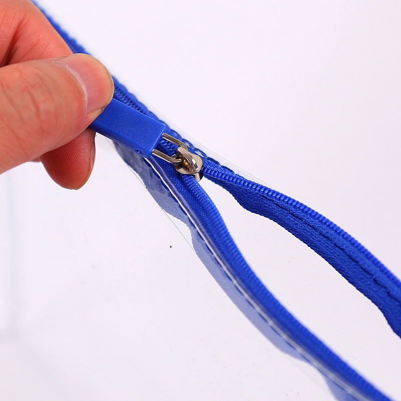 A4 A5 A6 Zipper File Bag var lavet af klart pvc materiale med blå nylon tænder lynlås, det ser enkelt og elegant ud. Det er meget nyttigt til opbevaring af daglige skoleartikler og dagligt fornødenheder.